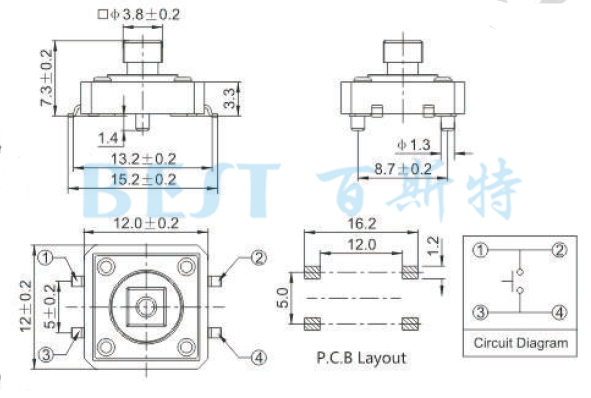 輕觸開關TS-1103C是一款仿歐姆龍開關的產品,它有四個定位柱和四個引腳,它的外觀長寬尺寸為12x12mm,也被稱呼為12x12輕觸開關,四腳輕觸開關12x12等。四個定位柱可以精確的定位開關在PCB板上的位置,防止開關移位,四個引腳可以使輕觸開關固定的更加牢固,開關的驅動力度有3個標準分別為:250克力,180克力,160克力,如需要其他的力度需要特別定制。此12x12輕觸開關只有一個高度為:7.3mm,顏色有黑色和黃色兩種。
